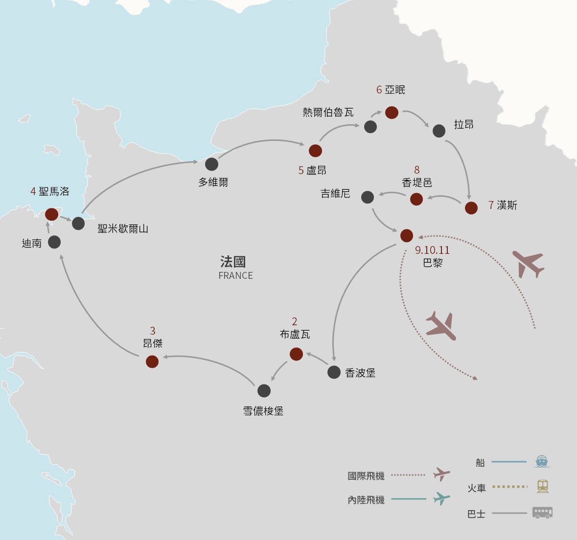 抵達夢想國度 – 法國。第一站來到法王弗朗索瓦一世為狩獵而建的香波堡,以壯麗雙螺旋階梯與文藝復興建築傲視群倫,是羅亞爾河最宏偉的城堡;鄰近的布盧瓦古城,城堡曾為多位君主寓所,結合哥德、文藝復興與古典風格,見證法國王朝興衰。