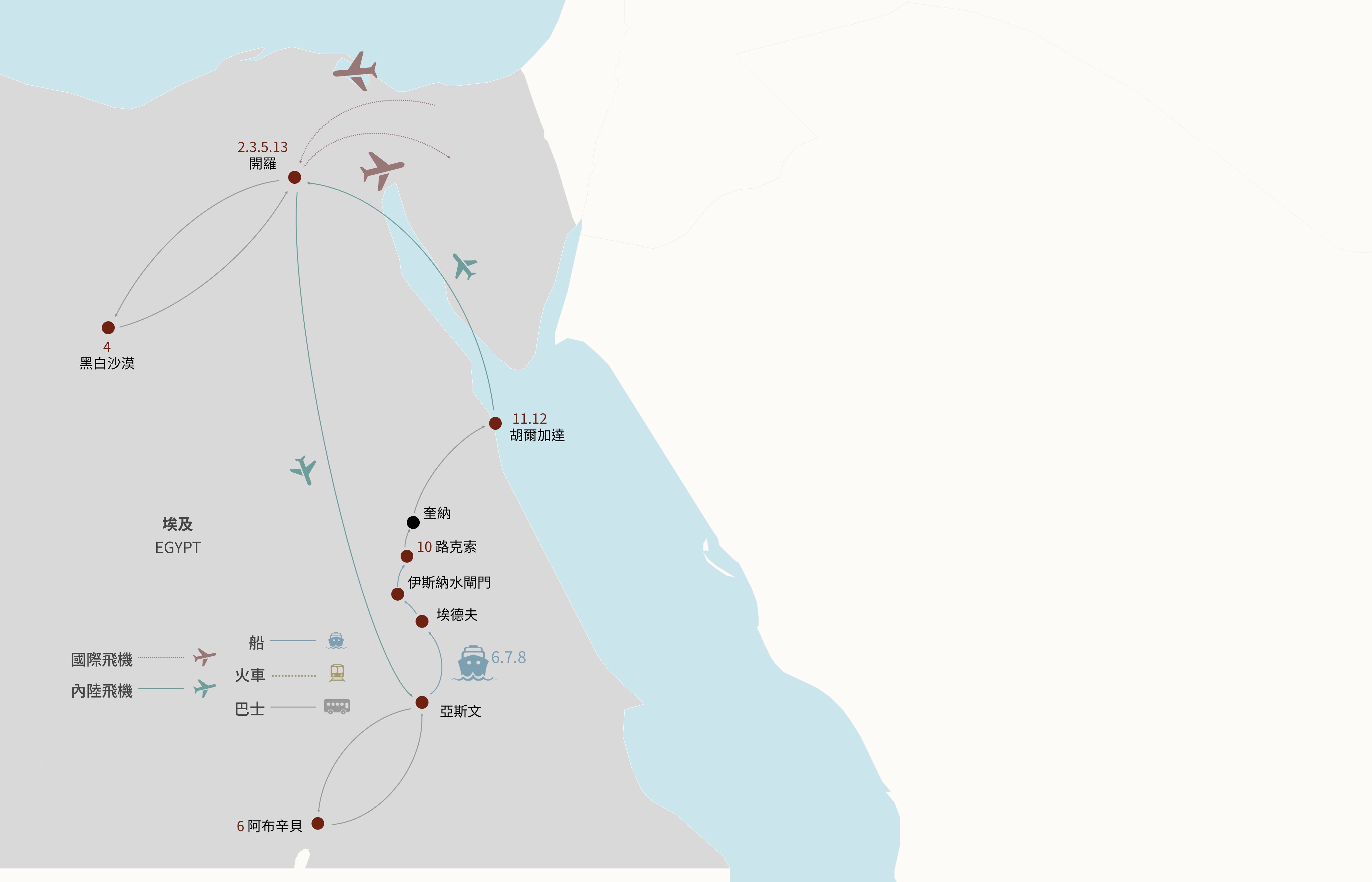 內陸段參考航班:SM90 開羅/亞斯文 08:00/10:10,請依說明會上時間為準~ 埃及國內段航班,托運行李1件23KG(長+寬+高=158cm) ,手提行李1件上限7KG。敬請留意。