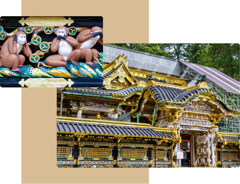 座落於日光群山之中,依山借勢,錯落有致。東照宮的建築精雕細刻,金碧輝煌,其中三隻代表「不看、不言、不聽」的猴子與眠貓更是非拍不可的景點。