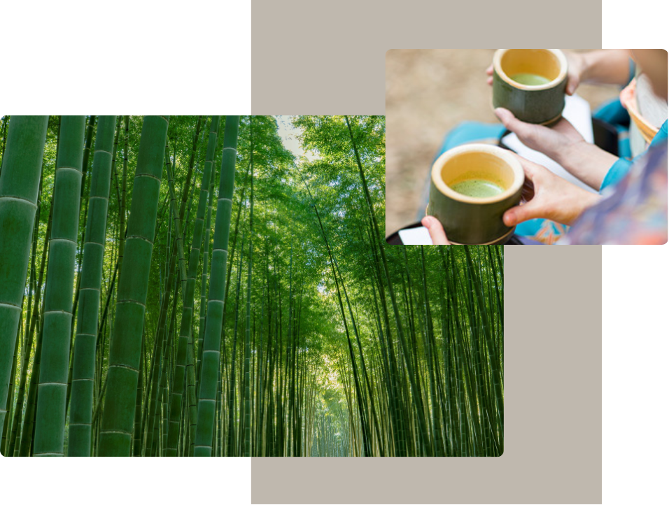 器皿由竹子製作而成,用其品嘗抹茶,置身在竹林中,聆聽自然的旋律