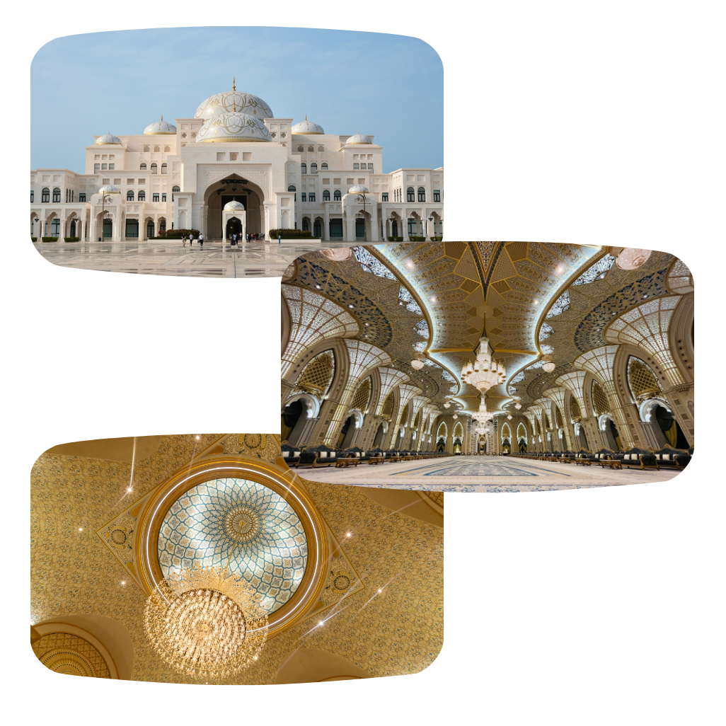 走進阿聯酋總統府(Qasr Al Watan),白色宮殿與金色穹頂映照在碧海藍天間,如詩如畫。踏入大門,挑高穹廳、幾何馬賽克與水晶燈散發極致奢華。館內不僅陳列阿聯酋的歷史與文獻,更以互動展覽揭開阿拉伯文化的神秘面紗。夜幕降臨,燈光與音樂交織成華美樂章,讓旅人流連忘返。