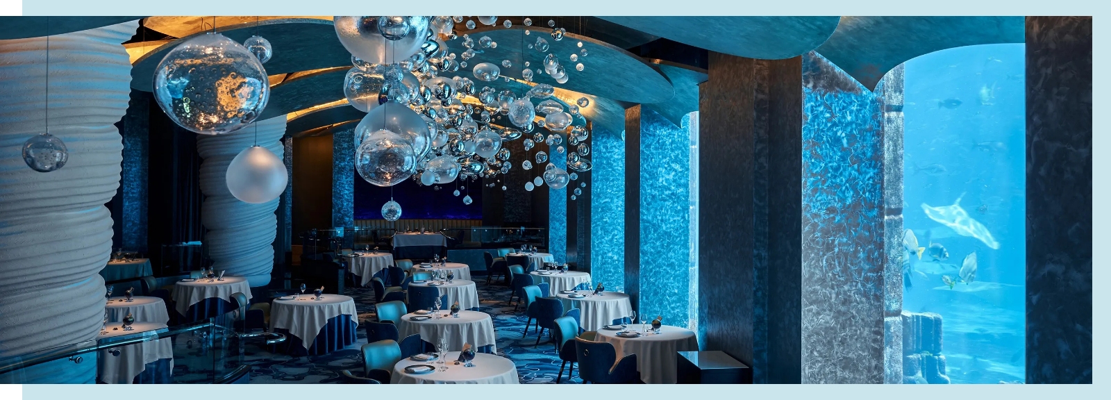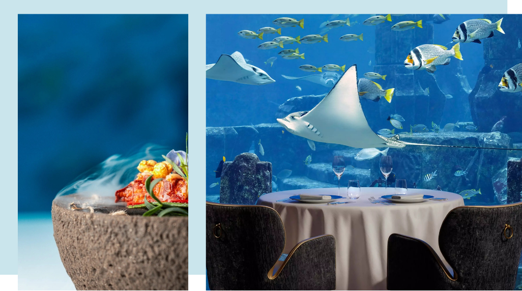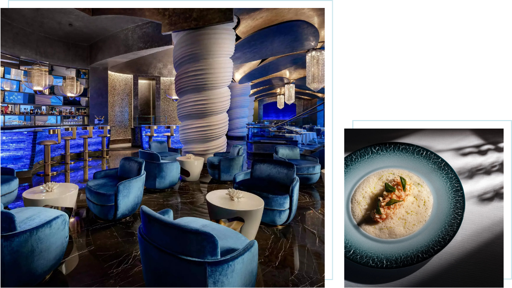 奧西亞諾海底餐廳宛如漂浮在深藍夢境中,坐落於杜拜阿特蘭提斯棕櫚島。五彩魚群悠然穿梭,水光閃爍如碎鑽般折射天光。落地玻璃窗外,阿拉伯灣的碧海波光粼粼,遠方杜拜天際線,晨曦與落日的光影在海水中流轉。餐廳以米其林星級料理聞名,主廚巧妙融合新鮮海鮮與頂級食材,將色彩、香氣、擺盤與味覺精準交織。每道前菜、每份甜點,彷彿都是精心雕琢的藝術品,與環繞的海底世界相互輝映,讓味覺與視覺同時沉浸於奢華與夢幻之中。當波光映照餐桌,魚群穿梭於水中,星級美饌化作舌尖上的詩篇,每一刻都是海底流動的畫卷,讓旅人沉醉於杜拜的藍色奇幻,記憶永不褪色。
