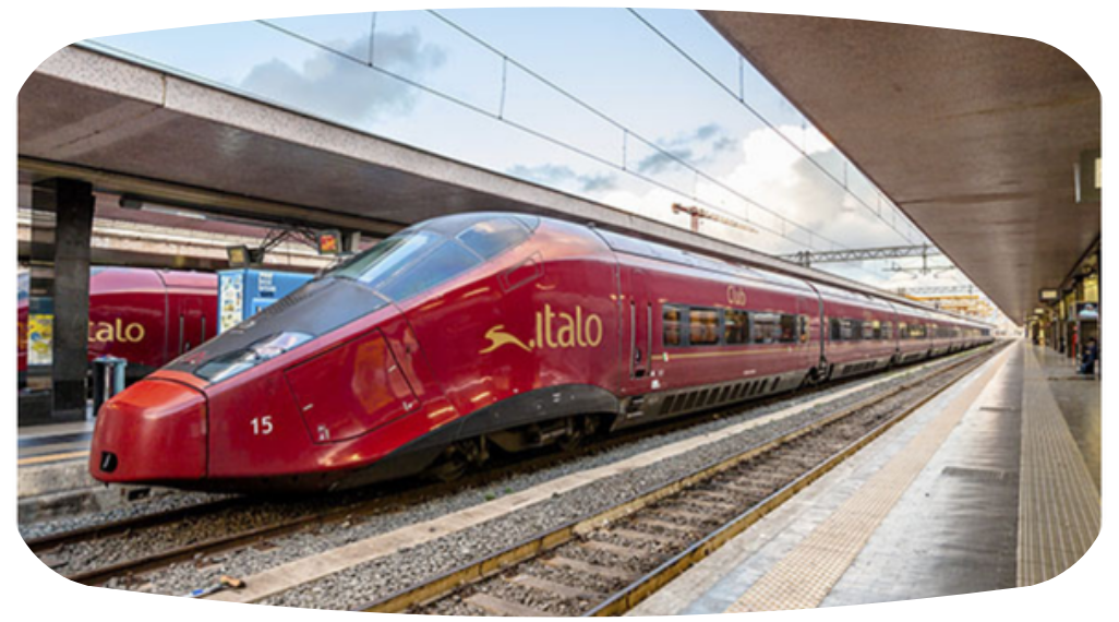 Italo AGV 是義大利高速列車品牌 Italo 的高性能列車,由法國阿爾斯通 (Alstom) 製造。它的設計靈感與技術部分受到 法拉利 的空氣動力學與輕量化理念啟發,流線型車身如同賽車般優雅,兼顧速度與效率。AGV 可達最高營運速度 300 公里/小時,車內設有舒適座椅、空調、多媒體娛樂及免費 Wi-Fi,分為經濟、舒適、頂級艙等。主要行駛於義大利北部與南部主要城市間,提供快速、便捷且環保的城際交通選擇。
