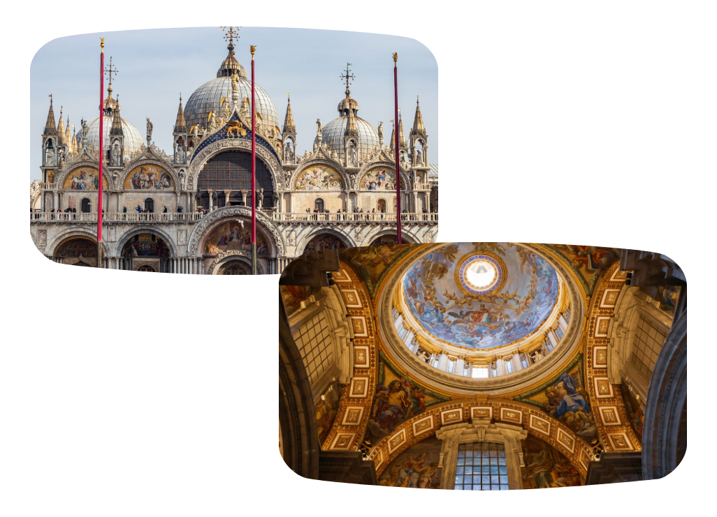 聖馬可大教堂坐落在城市最熱鬧的廣場,金色馬賽克在陽光下閃閃發亮,宛如童話般的神聖殿堂。踏入教堂,映入眼簾的是精緻的圓頂與天花板,壁畫細膩描繪宗教故事,讓人仿佛穿越千年歷史。外牆拱門與雕像結合羅馬、哥德與拜占庭風格,充滿藝術感。教堂曾是總督的禮拜堂,如今成為城市的宗教與文化中心。遊客可沿著運河走近教堂,遠眺倒影映在水面上,別有一番浪漫氛圍。無論欣賞藝術、拍照留念,還是感受古老歷史,這裡都能帶來震撼與感動。