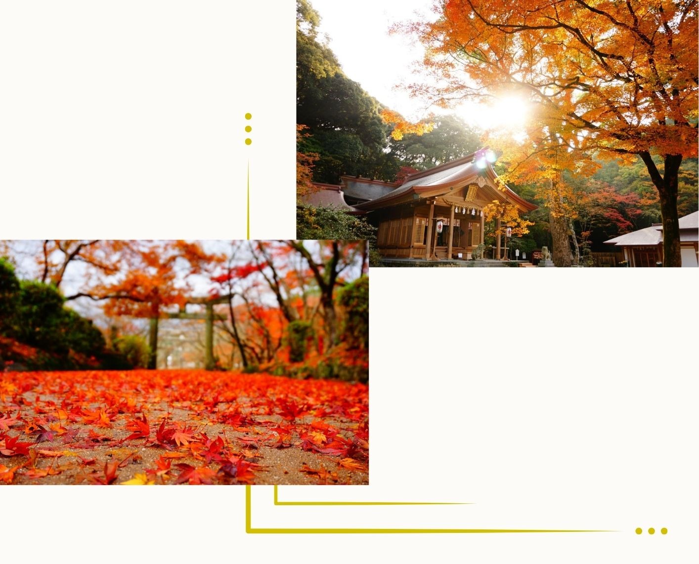 拾級而上,漫步於紅葉築成的自然隧道,看夕陽穿透楓葉染紅古老神社。