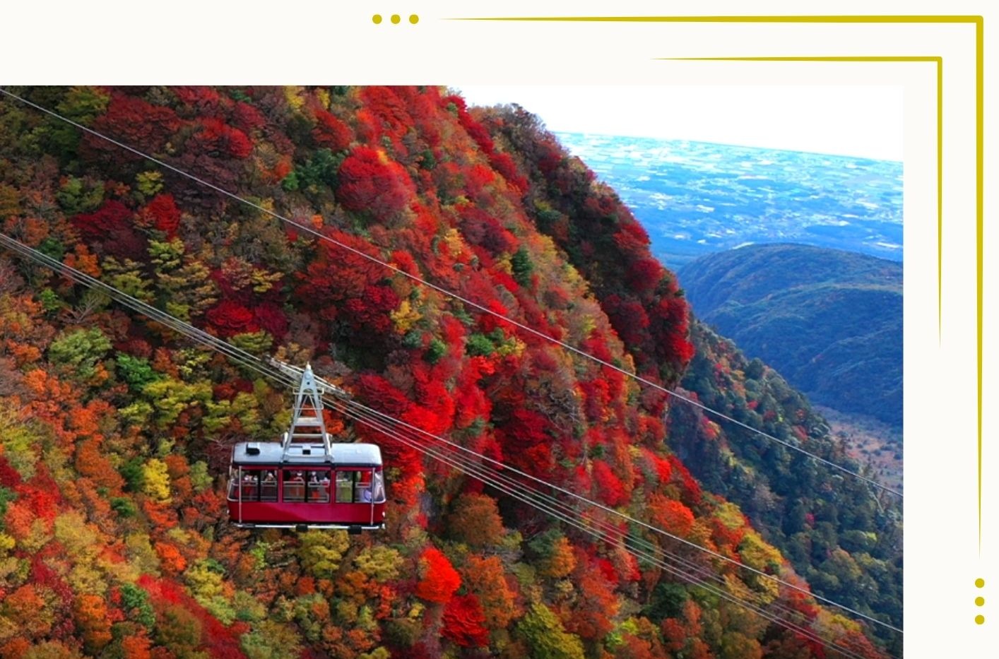 搭乘纜車凌空而上,俯瞰普賢岳染上紅、黃、橘的斑斕色彩。