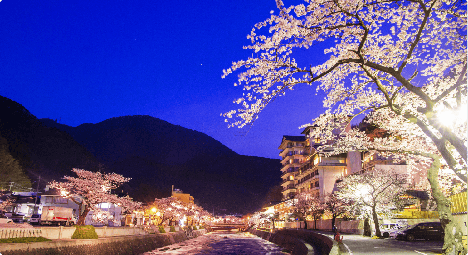 這裡的夜櫻沒有都市的喧囂,只有潺潺水聲與花影搖曳的浪漫。讓您在溫泉鄉的溫暖氛圍中,享受一場獨一無二的夜櫻饗宴。