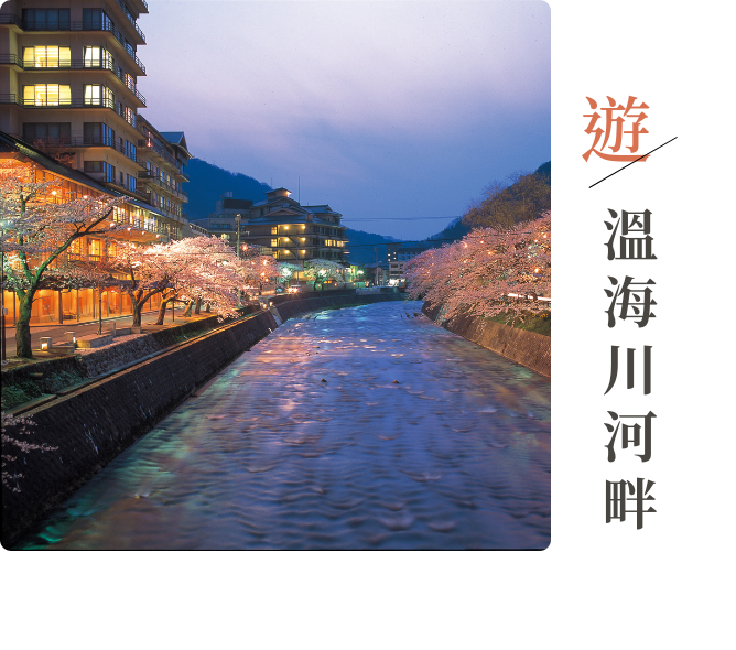 夜幕低垂,溫海川畔便亮起了夢幻的燈光,將兩岸盛開的櫻花映照得如詩如畫。在溫海溫泉鄉,您可以漫步於溫海川河畔,感受夜間的靜謐。柔和的燈光點亮了每一朵櫻花,花影倒映在清澈的溪流中,如夢似幻。