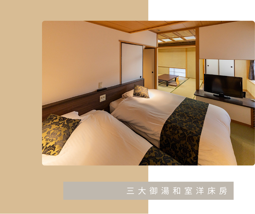 璽品精選「和室洋床房」房型,巧妙地融合了日式美學與現代舒適。此房型不僅保留了傳統疊蓆的溫潤與日式拉門的典雅,讓您能感受溫泉飯店的款待氛圍;也配置了舒適的西式床鋪,可以在體驗傳統文化的同時,也能享有熟悉的睡眠品質。