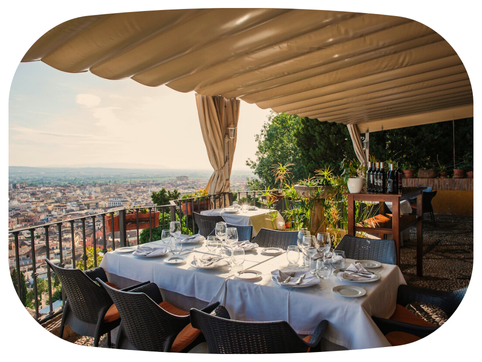 坐落於聖米格爾山丘上,俯瞰格蘭納達的景致,享用精緻安達魯西亞佳餚。當夕陽映照宮殿金紅色的外牆,整個城市被溫柔光影包圍,無論是美景還是餐點,皆讓人沉醉於格蘭納達的浪漫靈魂。