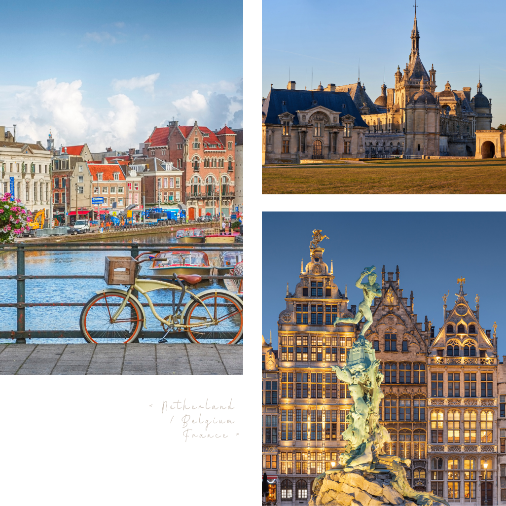 這是一場藝術與歷史交織的旅程——自荷蘭的運河與博物館群啟程,經比利時中世紀小城的鐘樓與廣場,再入法國的優雅心臟。香堤邑城堡如夢似幻,其華麗的圖書館與珍貴的藝術典藏,映照出法國貴族的浪漫與矜持。穿梭於古堡、石巷與河岸之間,時光緩緩流淌,訴說歐洲千年的文化厚度。夜幕下,光影交織於城牆與水面,彷彿將旅人帶入一場永恆的古典樂章。