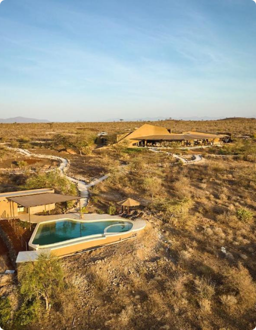 奢華露營酒店,提供獨特的非洲野生動物體驗。 酒店擁有16間豪華帳篷,每間帳篷均配備私人小型泳池,精心佈置於俯瞰Ewaso Nyiro與Isiolo河交匯處的高地上,背景是壯麗的Ololokwe山脈。 展現出獨特的「Safari-chic」風格,並融合了斯瓦希里與現代野生風情。